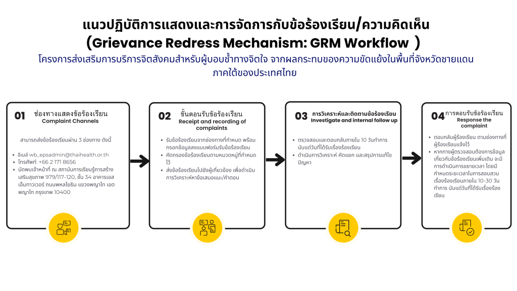 ช่องทางให้ผู้มีส่วนได้ส่วนเสียของโครงการในการแจ้งข้อเสนอแนะ ปัญหา และ/หรือแสดงข้อร้องเรียนที่เกี่ยวข้องกับกิจกรรม